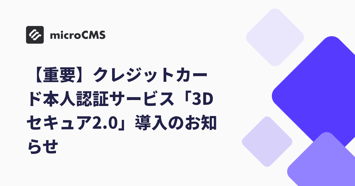 microCMSにおけるクレジットカードの不正利用の防止を強化し、お客様により安心・安全にお申し込みいただけるよう、クレジットカード決済の際に本人認証サービス「3Dセキュア2.0」を導入いたします。
