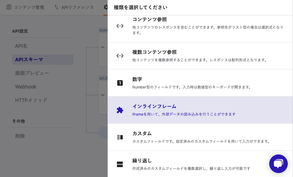 API設定 > APIスキーマの種類から「インラインフレーム」を選択します。