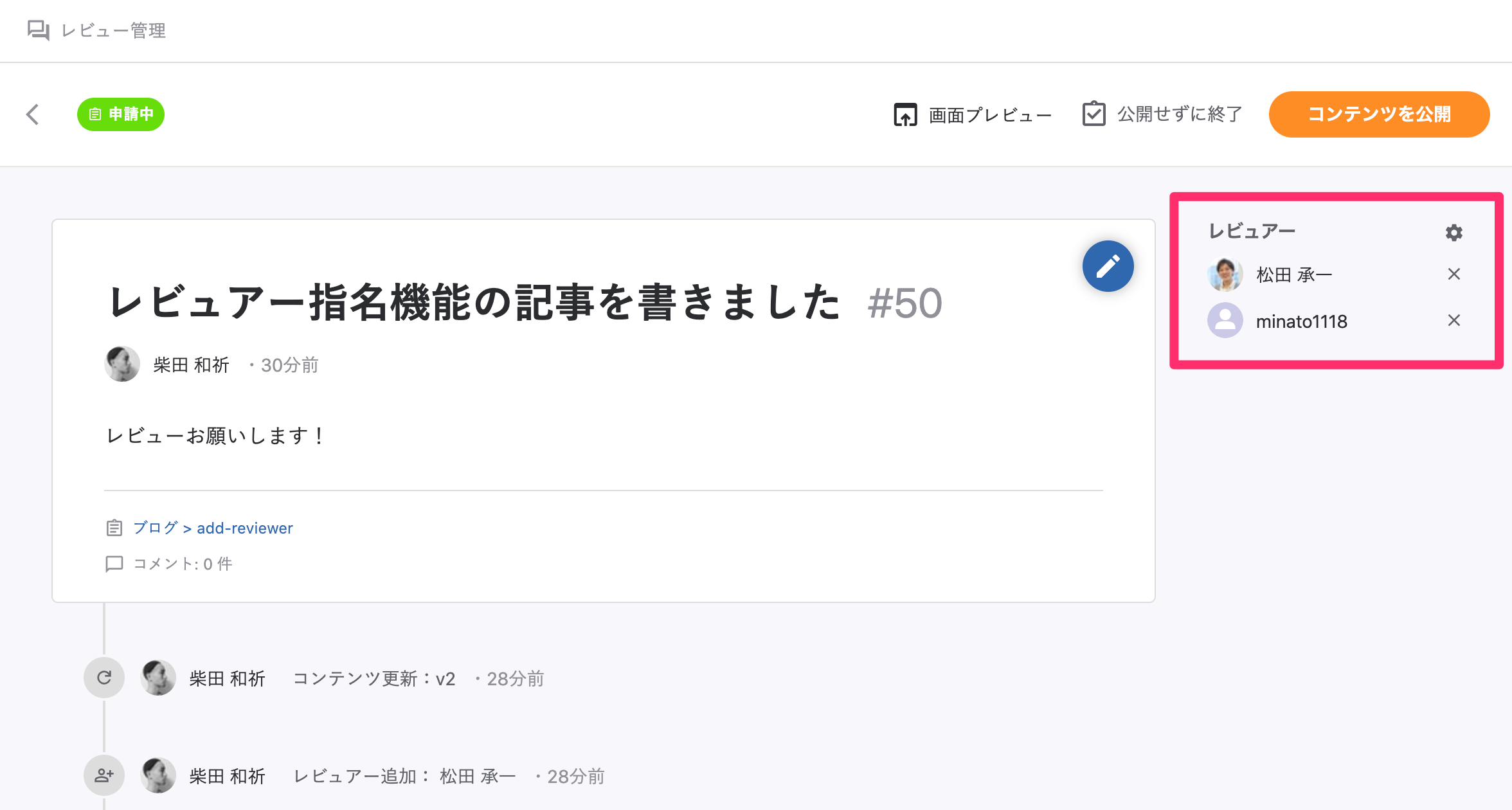 申請後はレビュー管理画面に移動し、タイムライン形式で情報が表示されます。