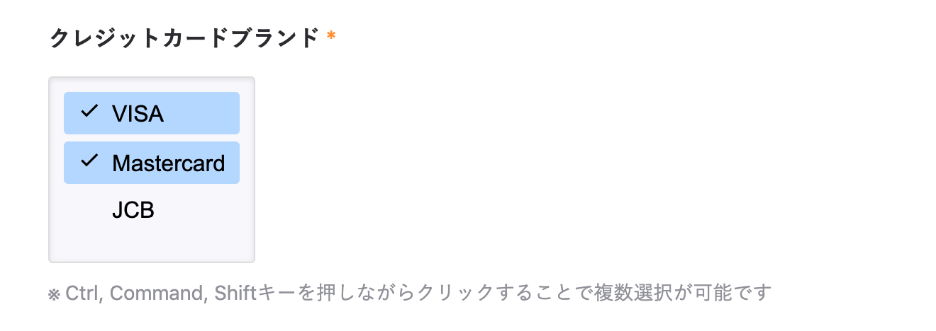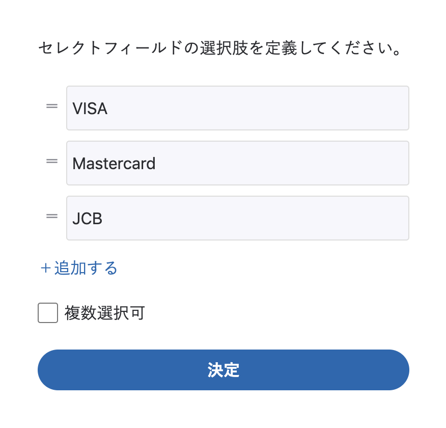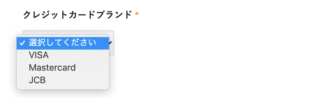 例えば、クレジットカードのブランドを選択するセレクトフィールドを作成する場合、以下のように設定します。
