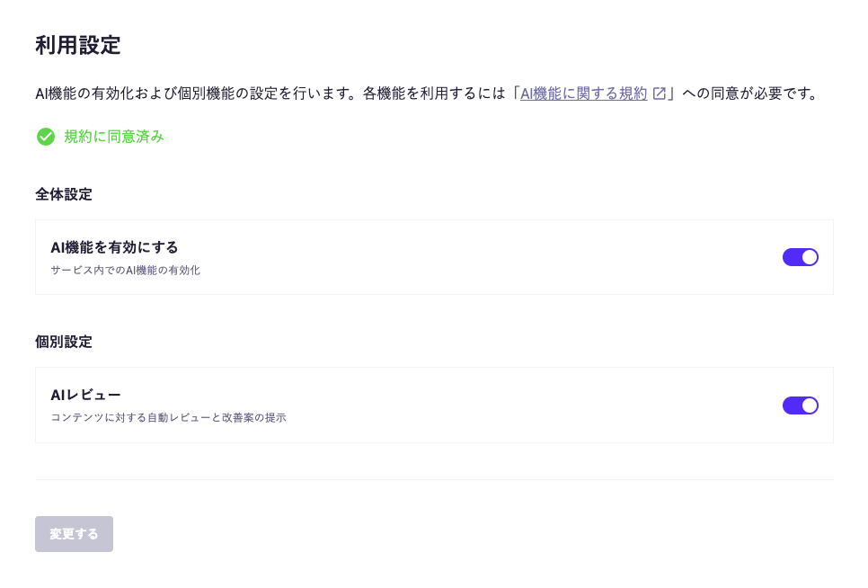 AI利用は、法務や社内運用の観点でも慎重な判断が求められやすい領域です。そのためmicroCMSではオプトイン方式を採用し、規約への同意を行ったうえで、AI機能全体と各機能を個別に有効化できる設計にしています。