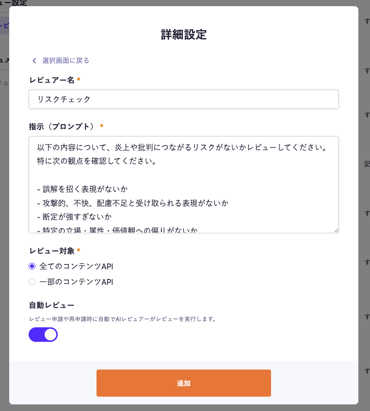 - AIレビュアーごとに名前、指示内容、対象API、自動レビューの有無を設定できる