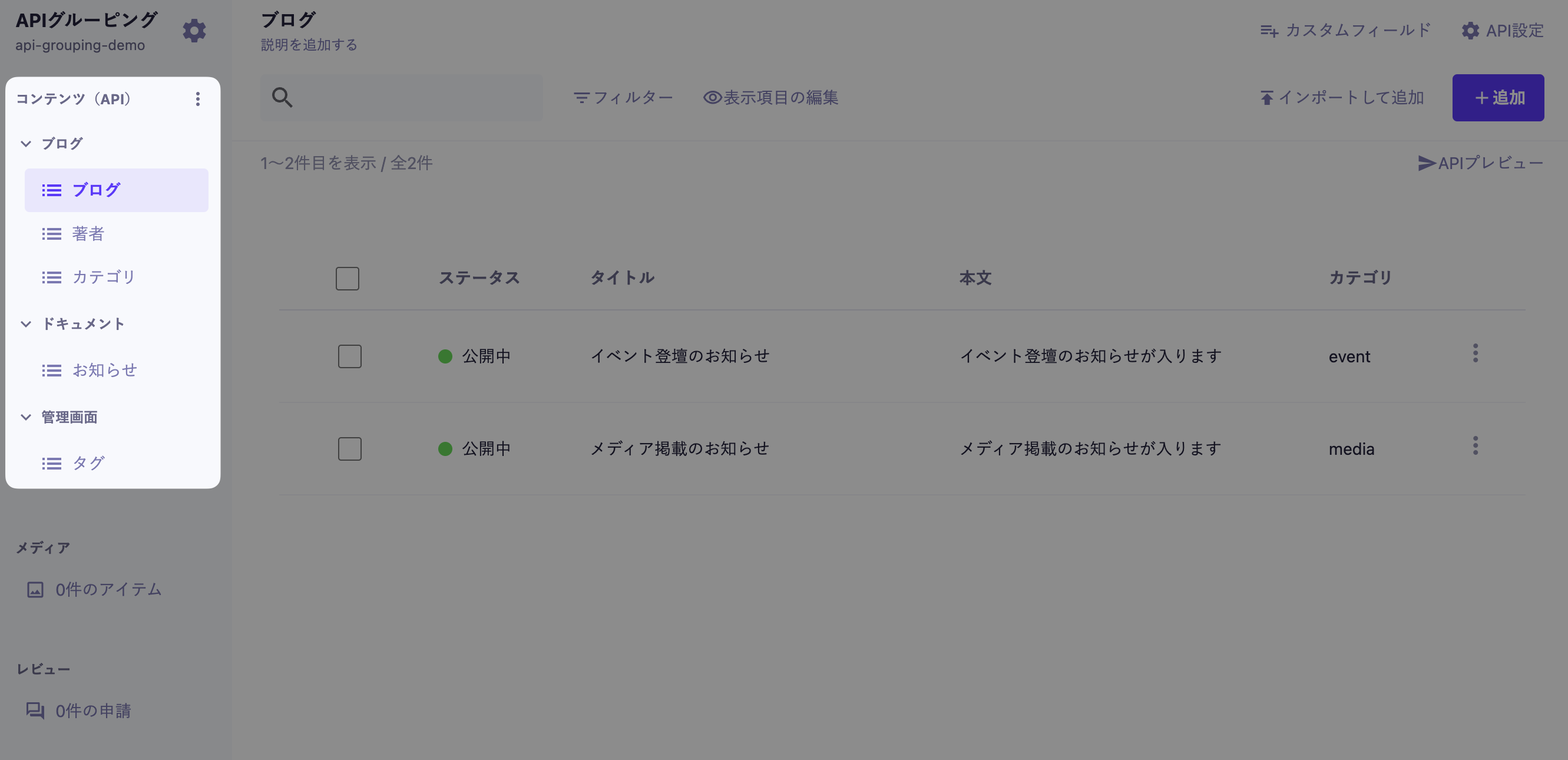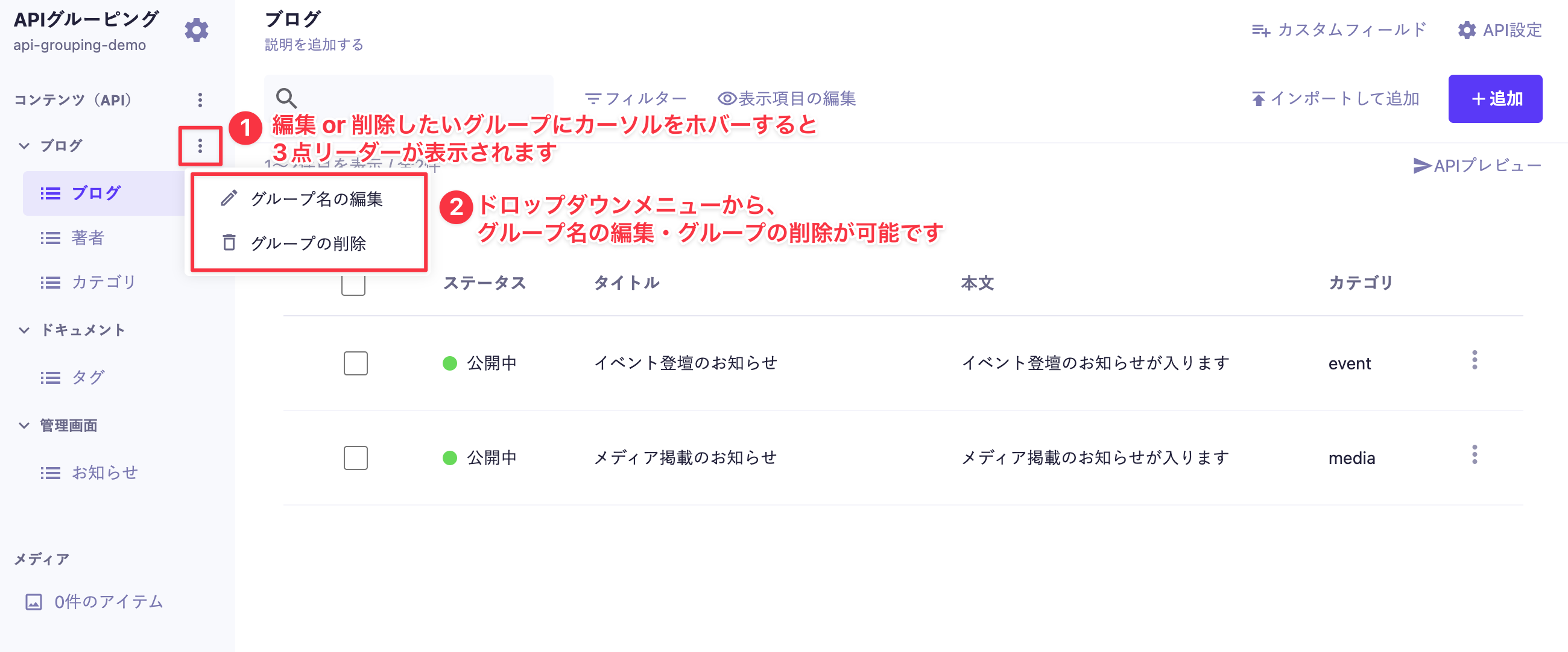 ※管理画面上での整理・分類を目的とした機能であり、エンドポイントやリクエスト、レスポンスには一切影響しません。