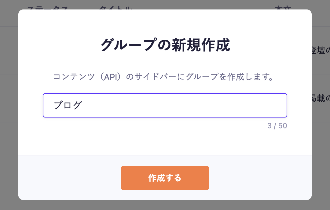 APIグループ名を入力し、[作成する]ボタンをクリックします。