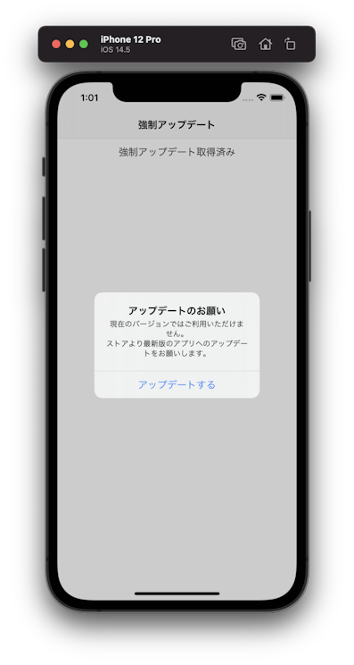 強制アップデートの条件に合致した場合、以下のようなアップデートを促すアラートが表示されます。