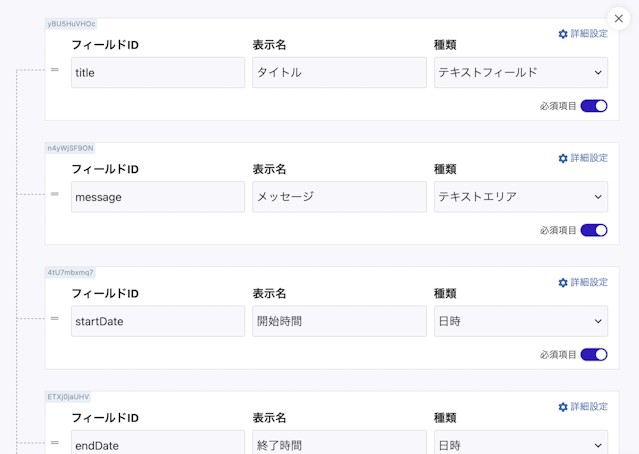 開始日や終了日など日時を表すフィールドには「日時」の種類を選んでおくと設定が簡単です。