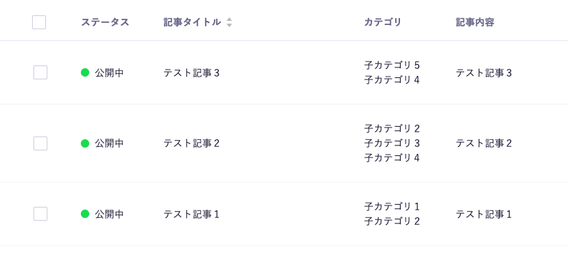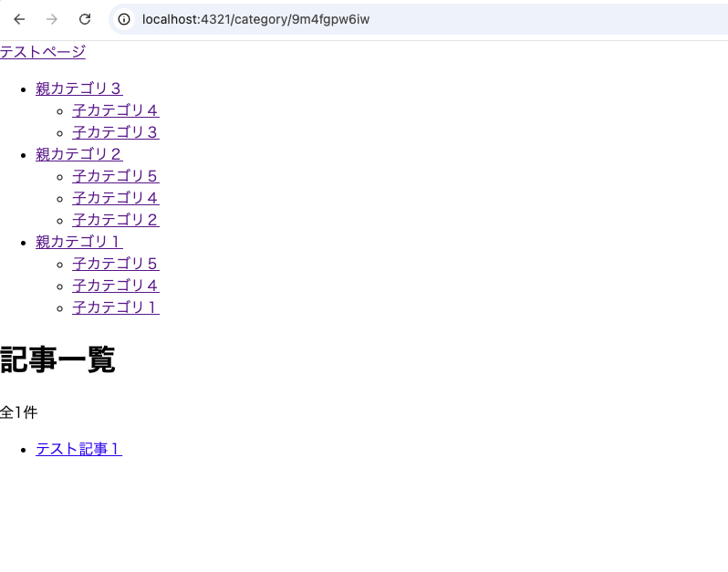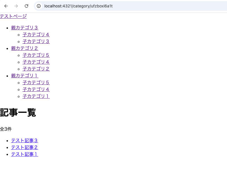 「親カテゴリ1」を親にもつ子カテゴリは「子カテゴリ1,4,5」ですから、これらをカテゴリのうちのひとつとしてもつ「テスト記事1,2,3」が表示されれば成功です。