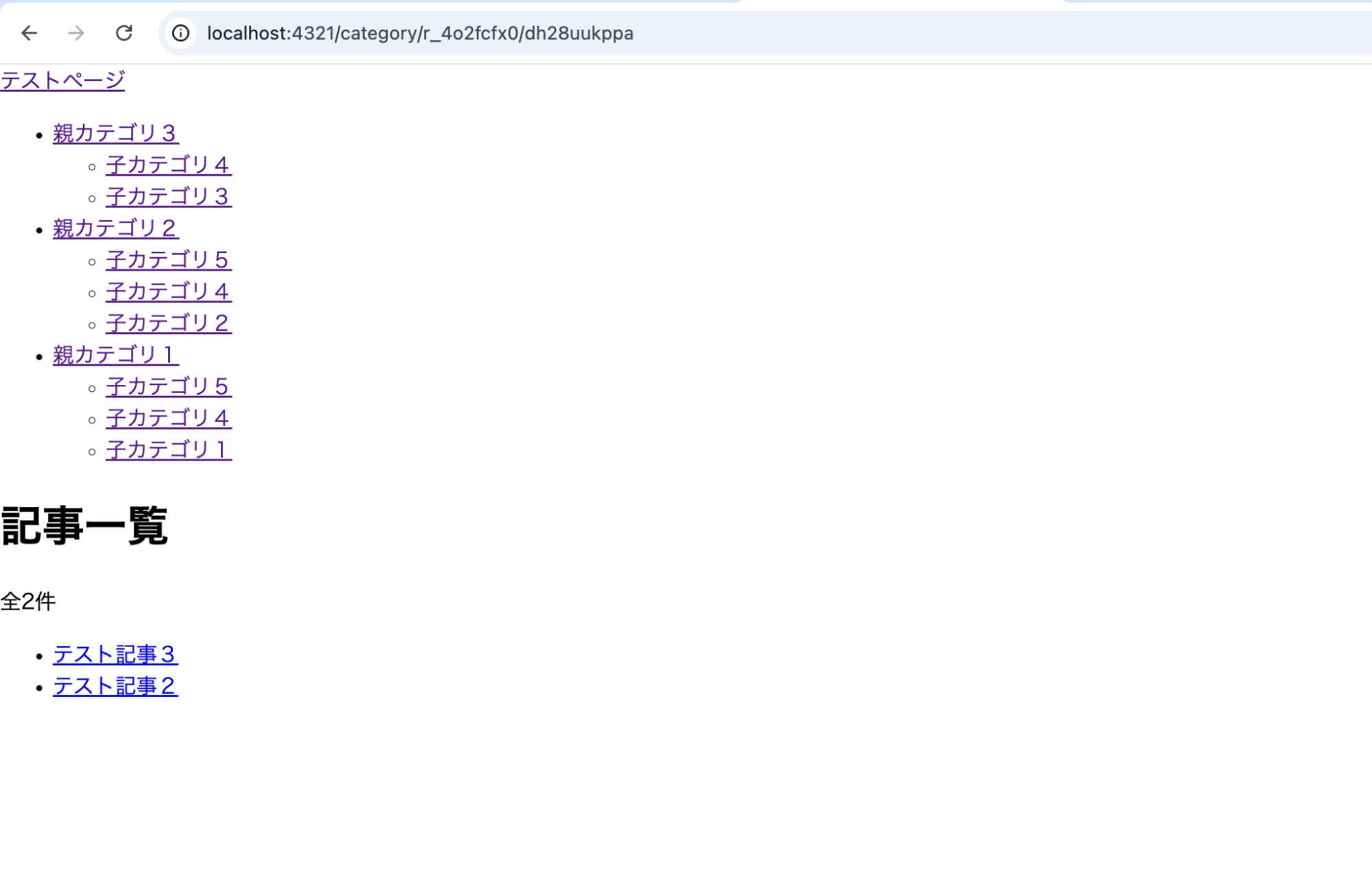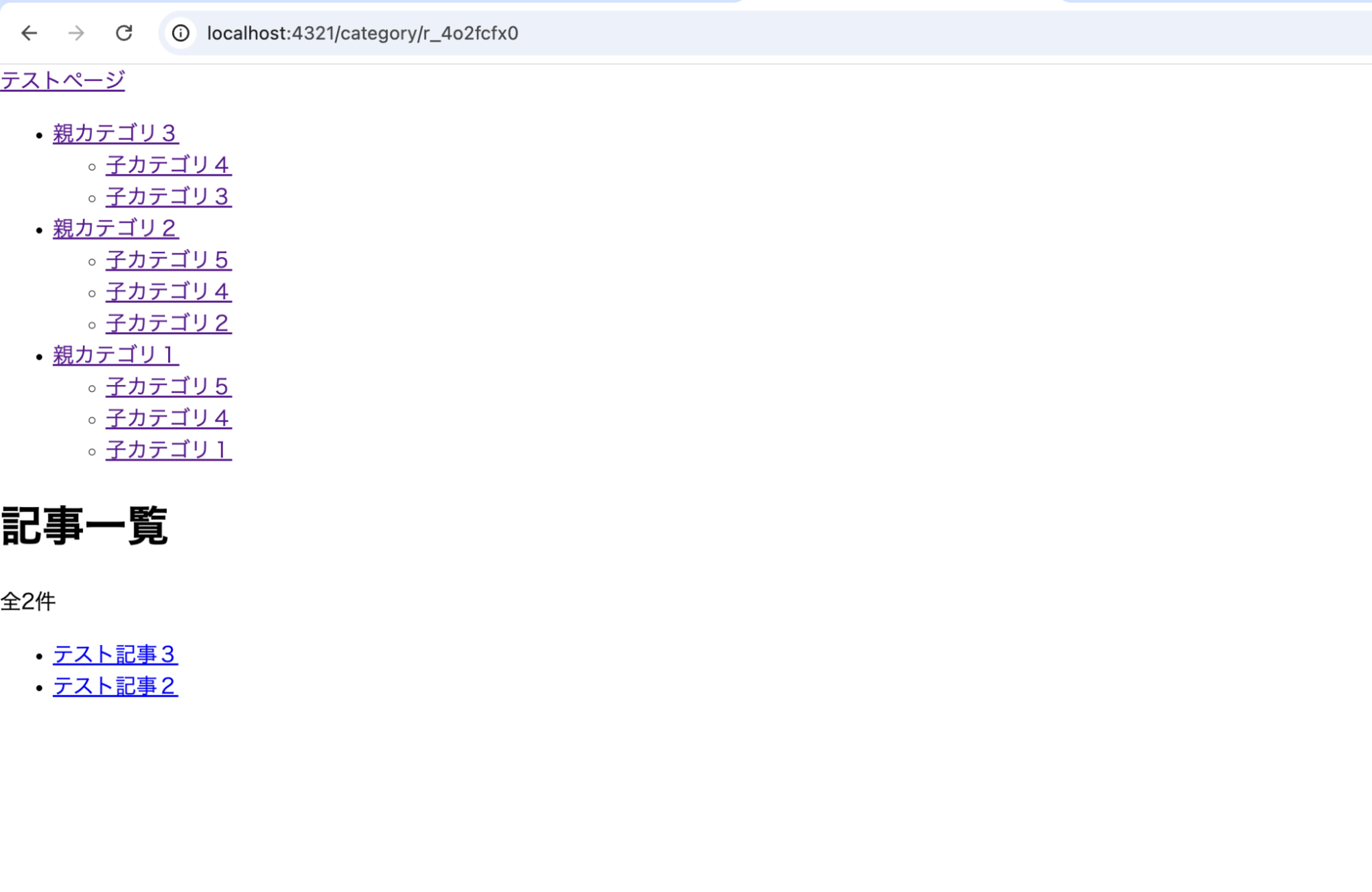 「親カテゴリ3」を親にもつ子カテゴリは「子カテゴリ3,4」ですから、これらをカテゴリのひとつとしてもつ「テスト記事2,3」のみが表示されれば成功です。