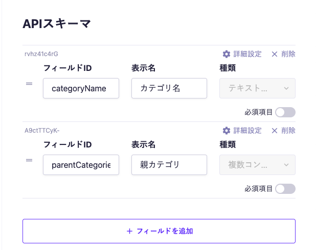 - 親カテゴリAPI(parent_category):テキストフィールドのみを持っています。このテキストフィールドは親カテゴリの名前として機能します。