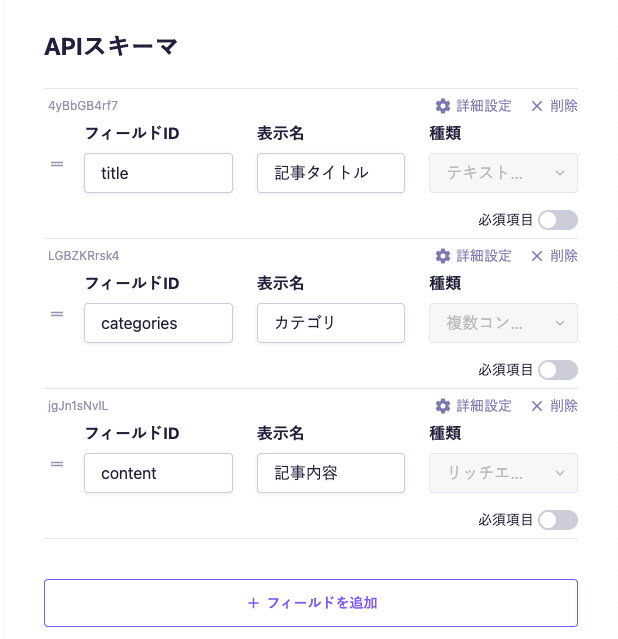 - 記事API(articles):テキストフィールド、リッチテキストフィールド、コンテンツ参照を持っています。テキストフィールドの役割は前述の二つと同様です。リッチテキストフィールドに記事の本文を格納して、コンテンツ参照では子カテゴリを参照させます。