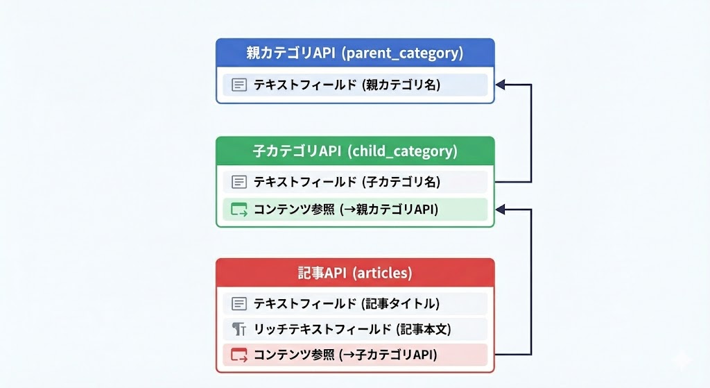 「親カテゴリを複数参照する子カテゴリ」と「子カテゴリを複数参照する記事コンテンツ」を用意することで、メディアサイトによくある「複数のカテゴリにまたがるタグ」と「複数のタグを持った記事」を再現しよう、という形です。