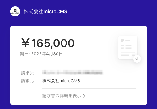 決済方法に請求書払いを設定された場合、お支払い予定日の当日にメールで請求書を送付いたします。メールの内容をご確認いただき、インボイスをダウンロードをクリックして請求書をダウンロードしてください。
