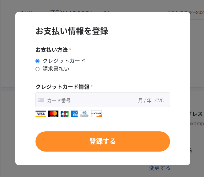 お支払い方法からクレジットカードと請求書払いを選択することができます。 (最初のお支払い情報の登録時)