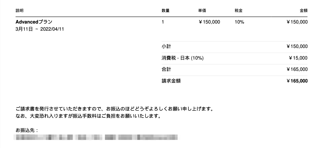 そして、請求書のフッター部分に振込先情報が記載してあります。