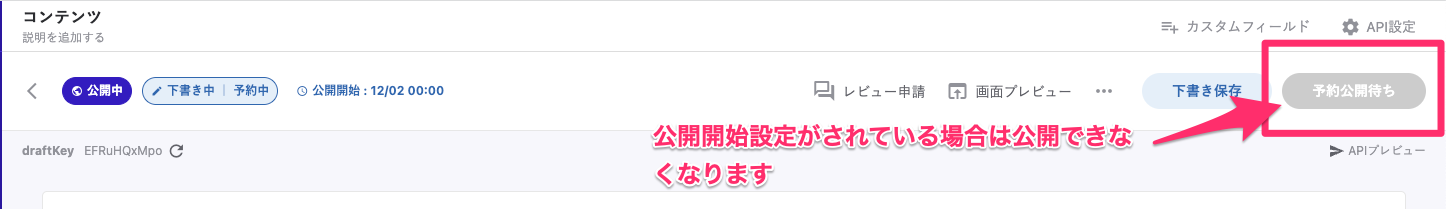 「公開」ボタンが「予約公開待ち」になります。公開設定がされたコンテンツを誤って入稿者が公開しないようになるかと思います。