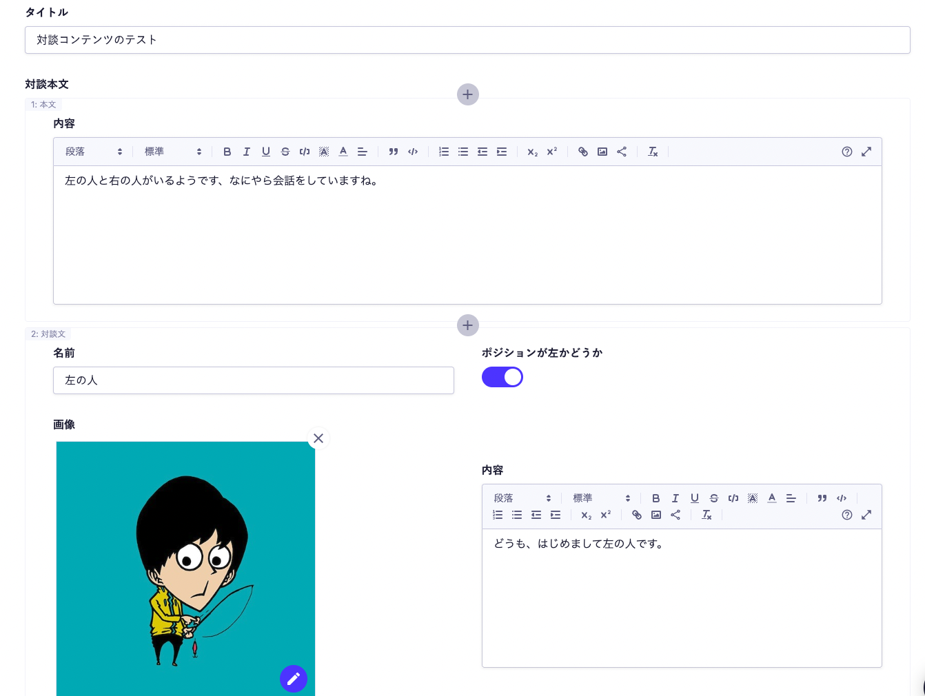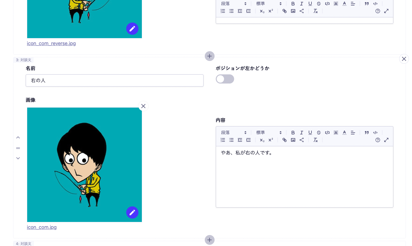 このケースですと、話者の名前や画像は毎回入力する形になっていますが、この部分はコンテンツ参照機能を使うなどのアップデートをすることで、より効率的に入稿することもできそうです。