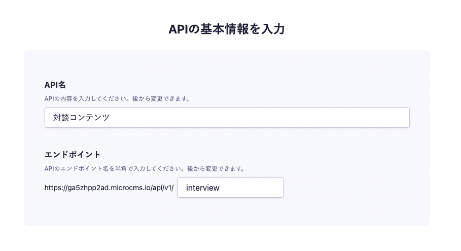 API名は「対談コンテンツ」、エンドポイントはinterviewとしました。なお、APIの型はリスト形式です。