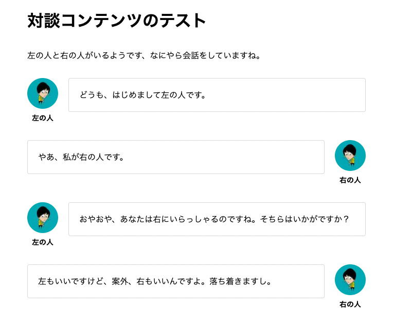 Webメディアの記事や採用コンテンツにおいて、以下のような、左右から吹き出しで人が話しているように見えるデザインにしたい場合があるかと思います。