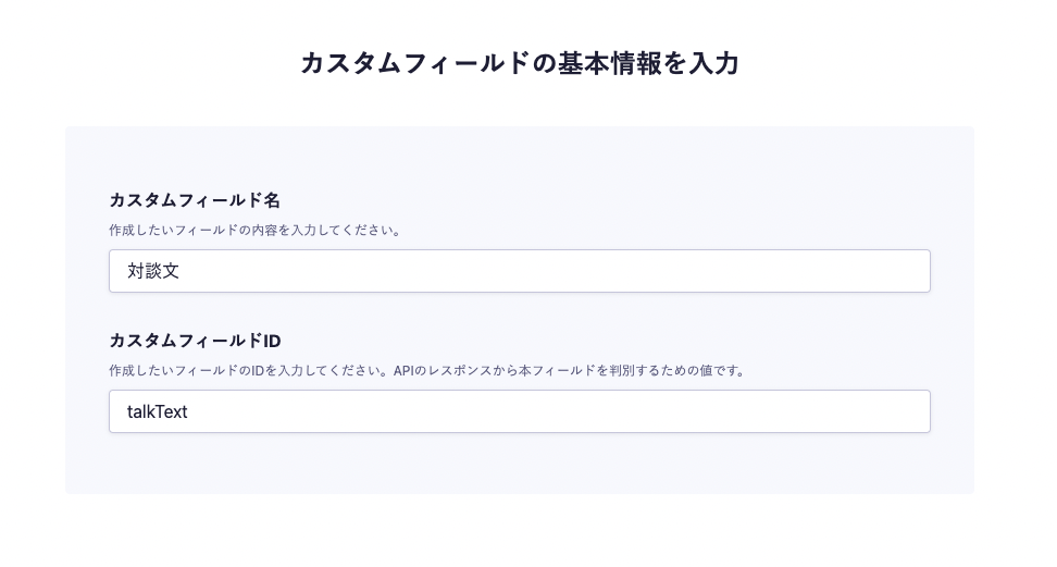次に対談文(talkText)のカスタムフィールドを作成します。本文と同様に基本情報を入力し、次のステップへ。