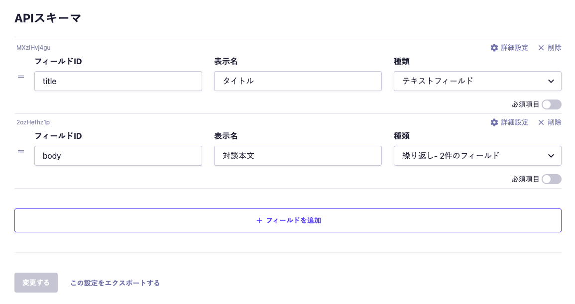 次は、元のインタビューAPIに、これらを繰り返しフィールドとして組み込んでいきます。titleはすでに登録しているので、ここにbodyとして対談本文用のフィールドを追加します。