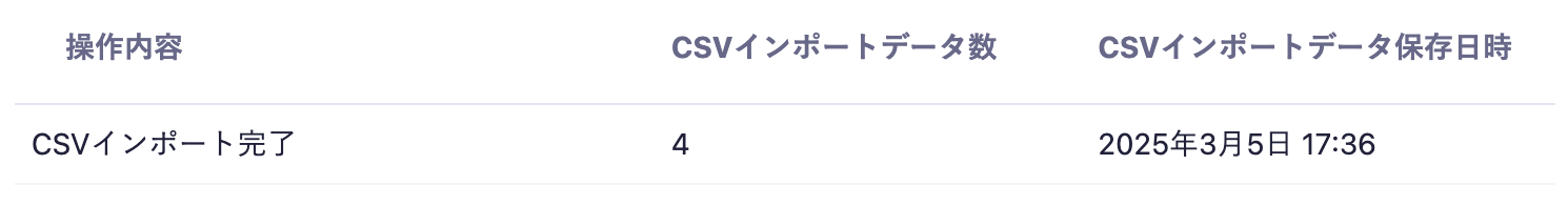 操作内容としてCSVインポート完了、CSVインポートデータ数、そして、CSVインポートデータ保存日時が記録されます。