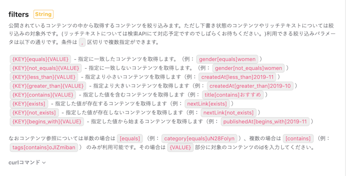 [contains] や [begins_with] のようにfiltersにはいくつかの使えるパラメータがあります。それぞれについて使用例を見ていきましょう。