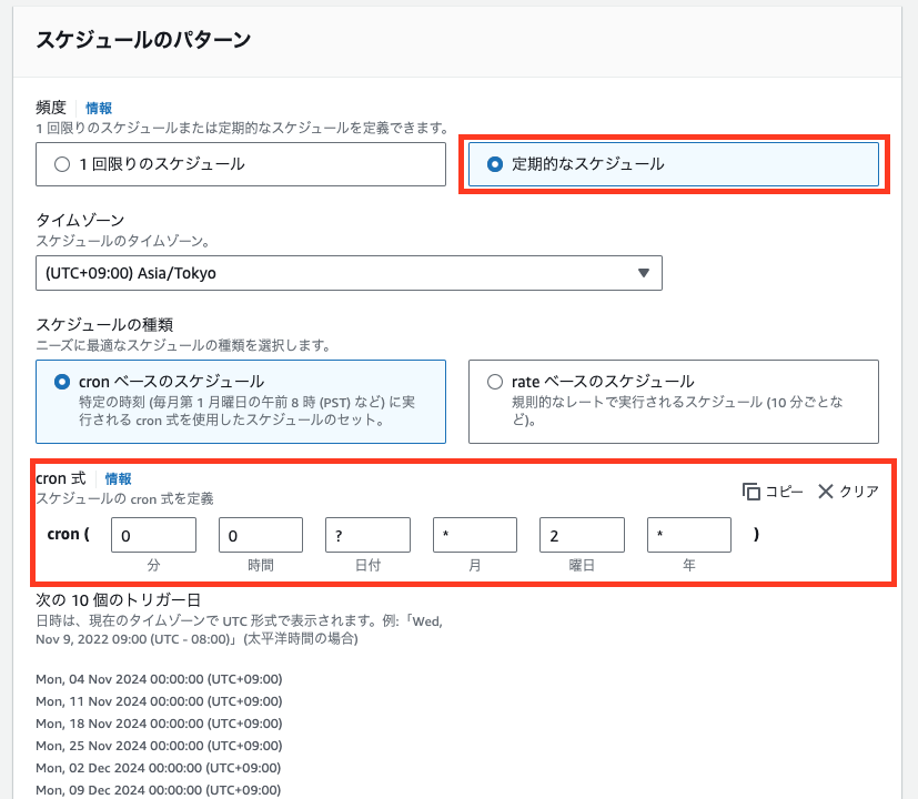 2. スケジュールのパターンを「定期的なスケジュール」にし、cron式に「0 0 ? * 1 *」を設定