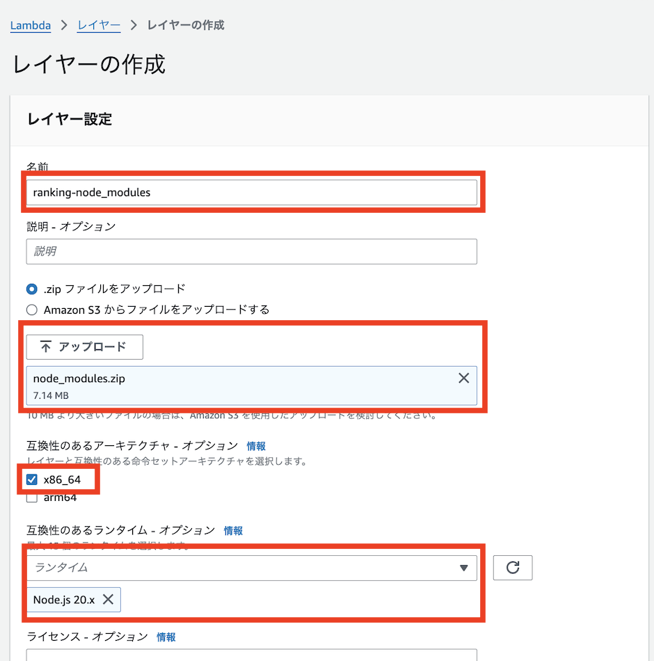 Lamda関数はサイズに制限があるため、使用するライブラリを含むnode_modulesはLamdaレイヤーにアップします。