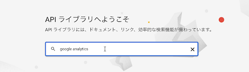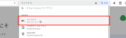 1. 作成したGCプロジェクトのヘッダーにある検索欄に「ライブラリ」と入力し、「ライブラリ(APIとサービス)」をクリックしてAPI ライブラリページにアクセス