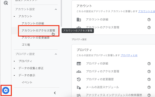1. 今回使用するGA4のプロパティを開き、「アカウントのアクセス管理」をクリック