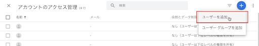先ほど作成したサービスアカウントをGA4のユーザーとして追加して、GA4のデータにアクセスできるようにします。