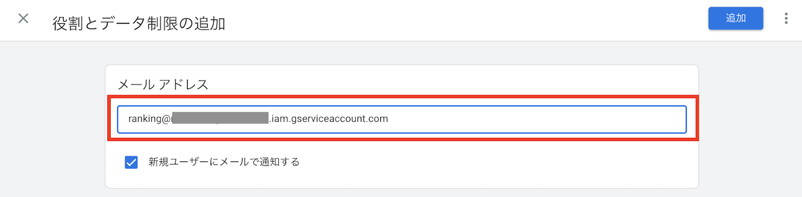 3. 先ほどGCで作成したサービスアカウントのアドレスを入力して追加