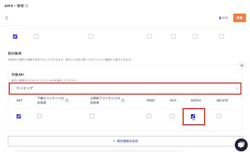 APIキー設定の個別権限設定から対象APIで先ほど作成した「ランキング」を選び、PATCHにチェックを入れます。