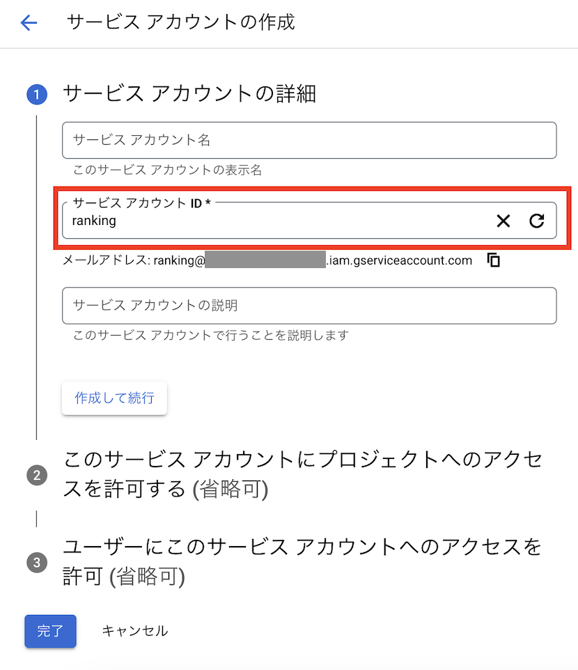 3. 「サービスアカウントID」にお好みのIDを設定し、完了をクリック