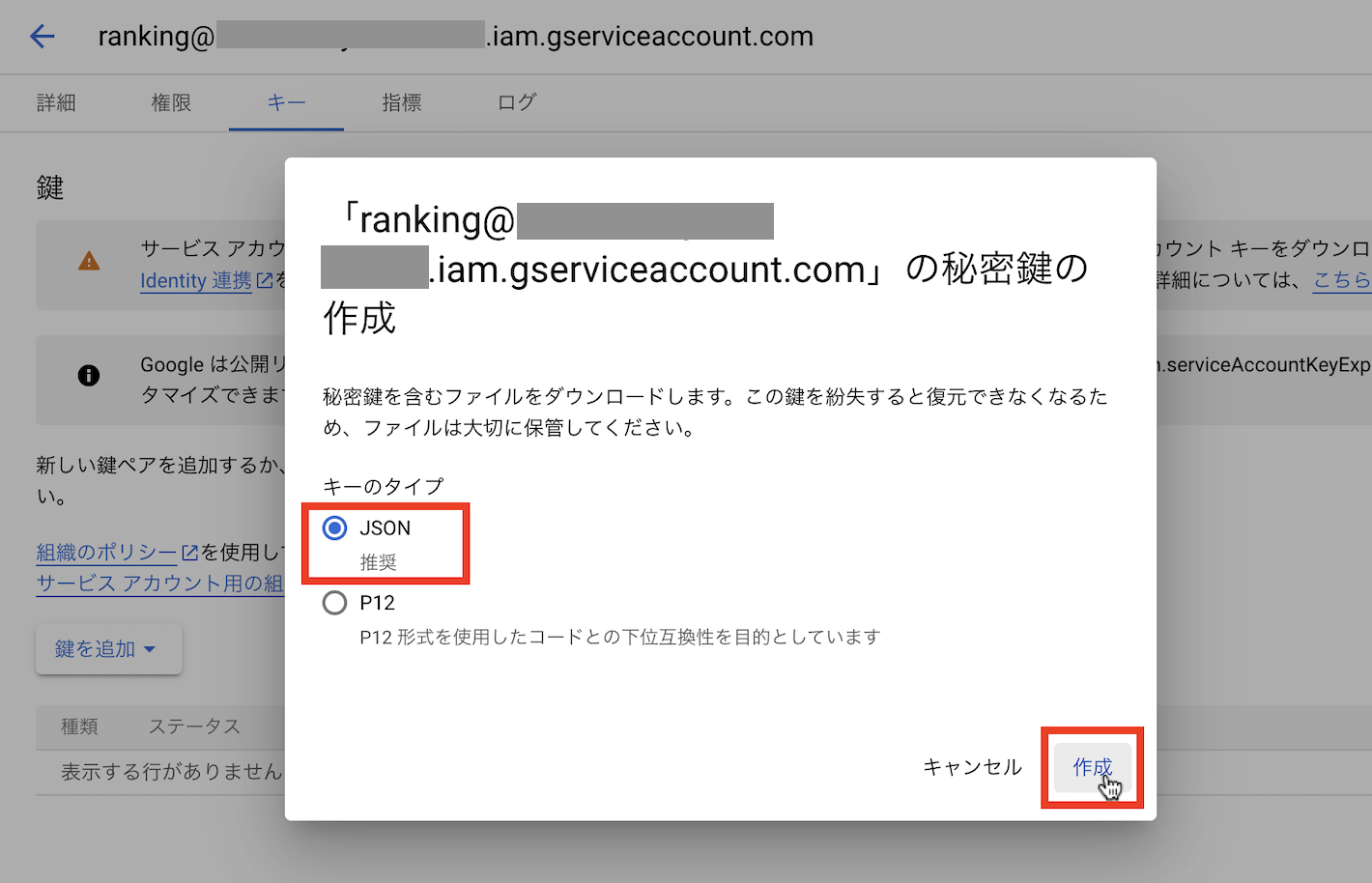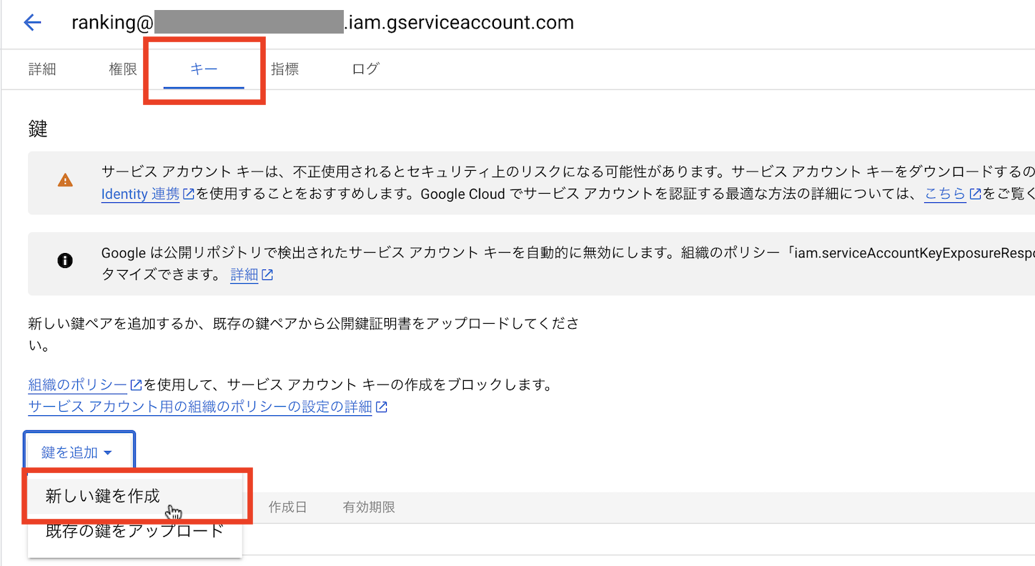 4. 作成したサービスアカウントを選択し、「キー」タブから新しい鍵を作成
