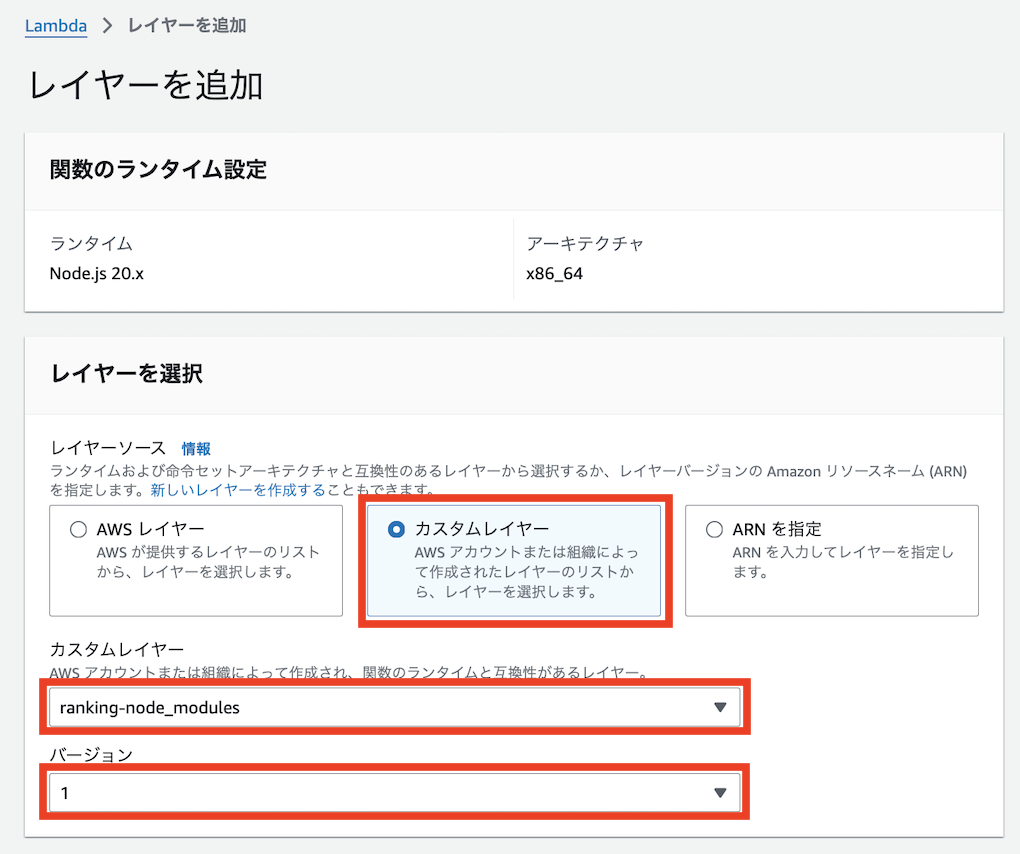3. 作成したLamda関数を開いた下にある、「レイヤーを追加」から先ほど作成した「ranking-node_modules」レイヤーを追加