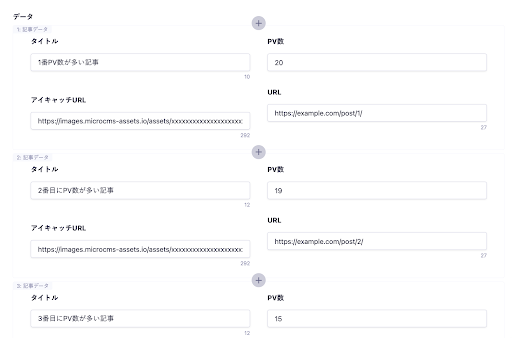ランキングデータが登録されているときは以下のようになります。上から順番にPV数が多い順に並べられます。