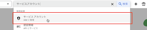 1. GCプロジェクトのヘッダーにある検索欄に「サービスアカウント」と入力し、「サービスアカウント(IAM と 管理)」をクリックしてサービスアカウントページにアクセス