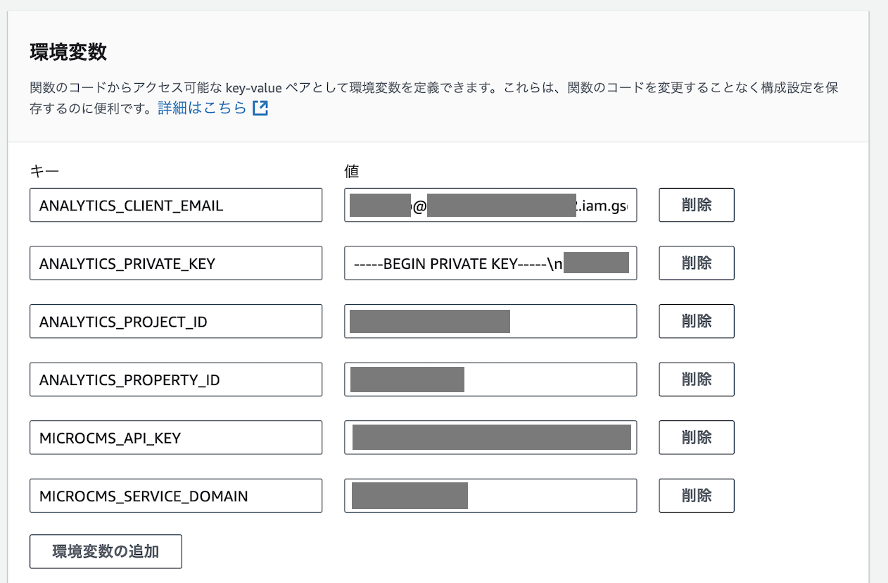 それぞれGA4やmicroCMSで使うAPIキーなどを設定します。