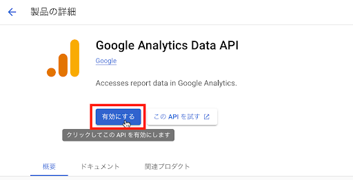 Google Analytics Data APIを使用するには、Google Analytics Data APIを有効化する必要があります。