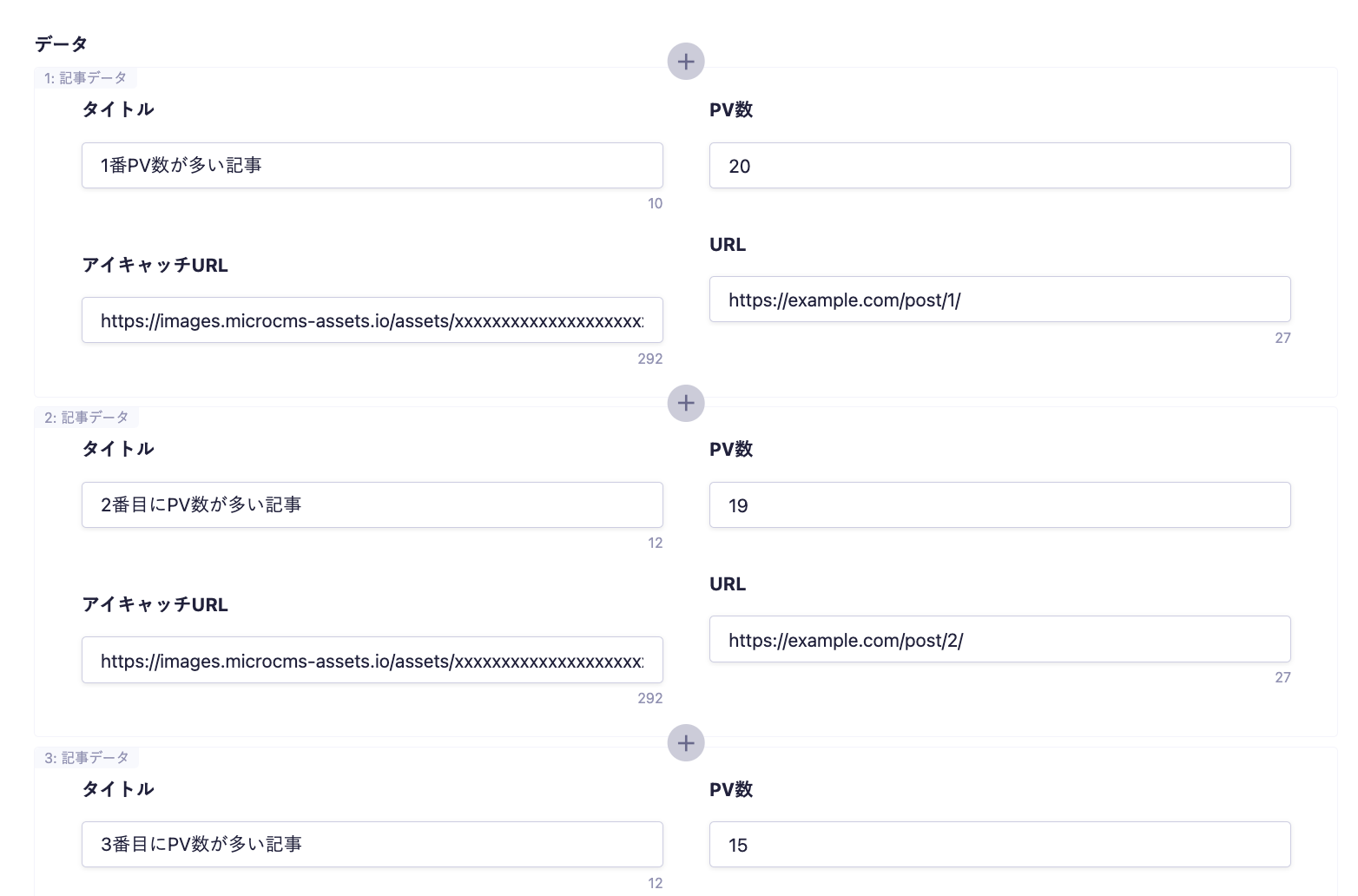 作成したLamda関数を実行し、microCMSのランキングページにデータが10件挿入されていれば作成完了です。