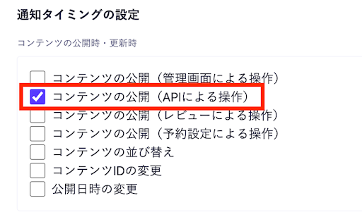 Webhookの通知タイミング設定のうち、「コンテンツの公開(APIによる操作)」のチェックボックスにチェックをします。