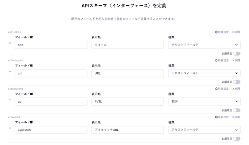 3. カスタムフィールドのスキーマにタイトル、URL、PV数、アイキャッチURLのフィールドを設定