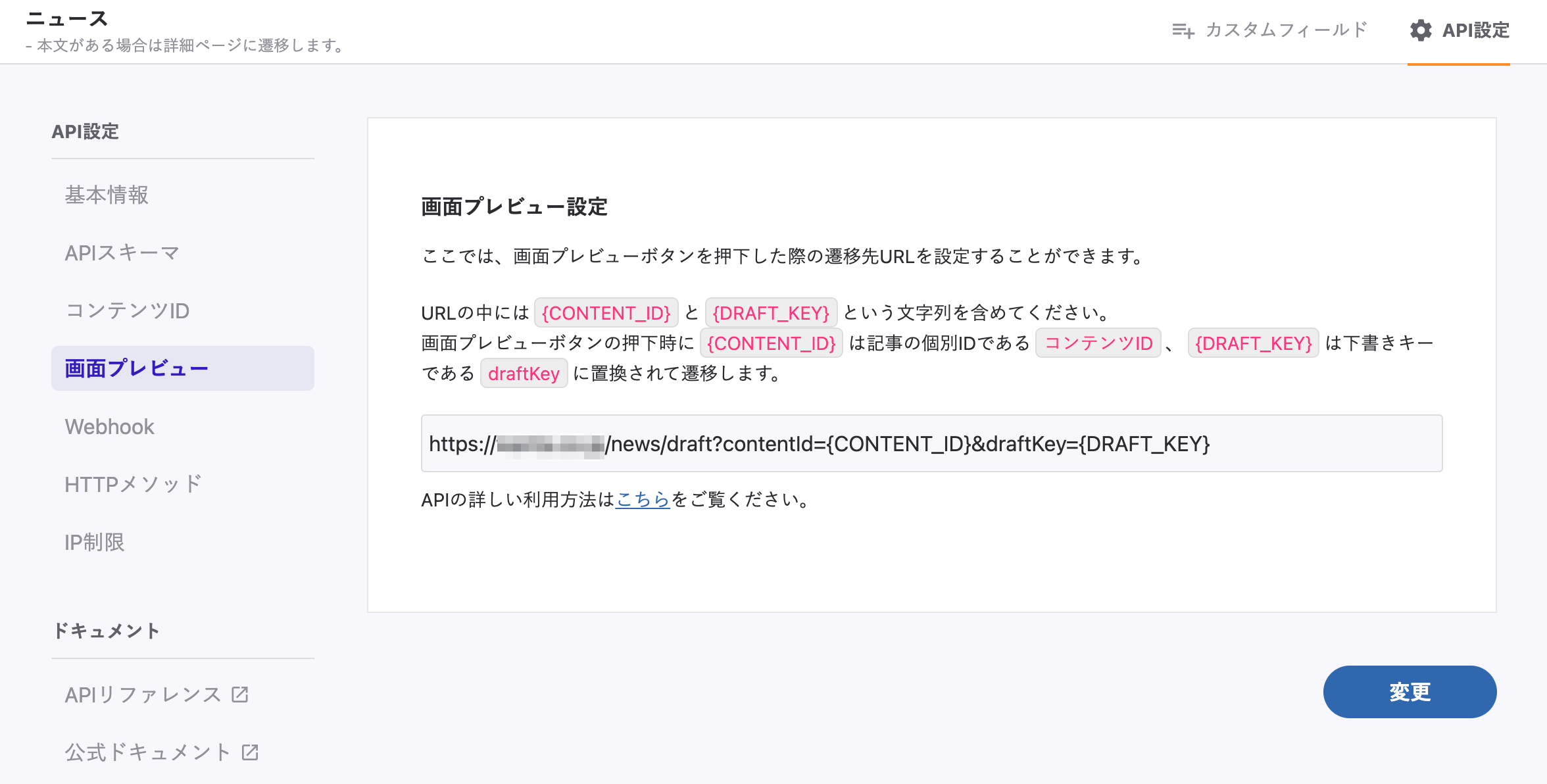 API設定 > 画面プレビューで、「画面プレビュー」ボタンをクリックした際の遷移先URLを指定することができます。