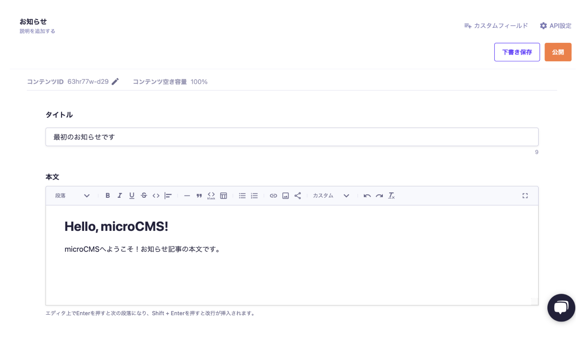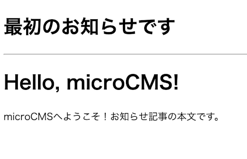 "body": "<h1 id=\"h7f0f65b40a\">Hello, microCMS!</h1><p>microCMSへようこそ!お知らせ記事の本文です。</p>"