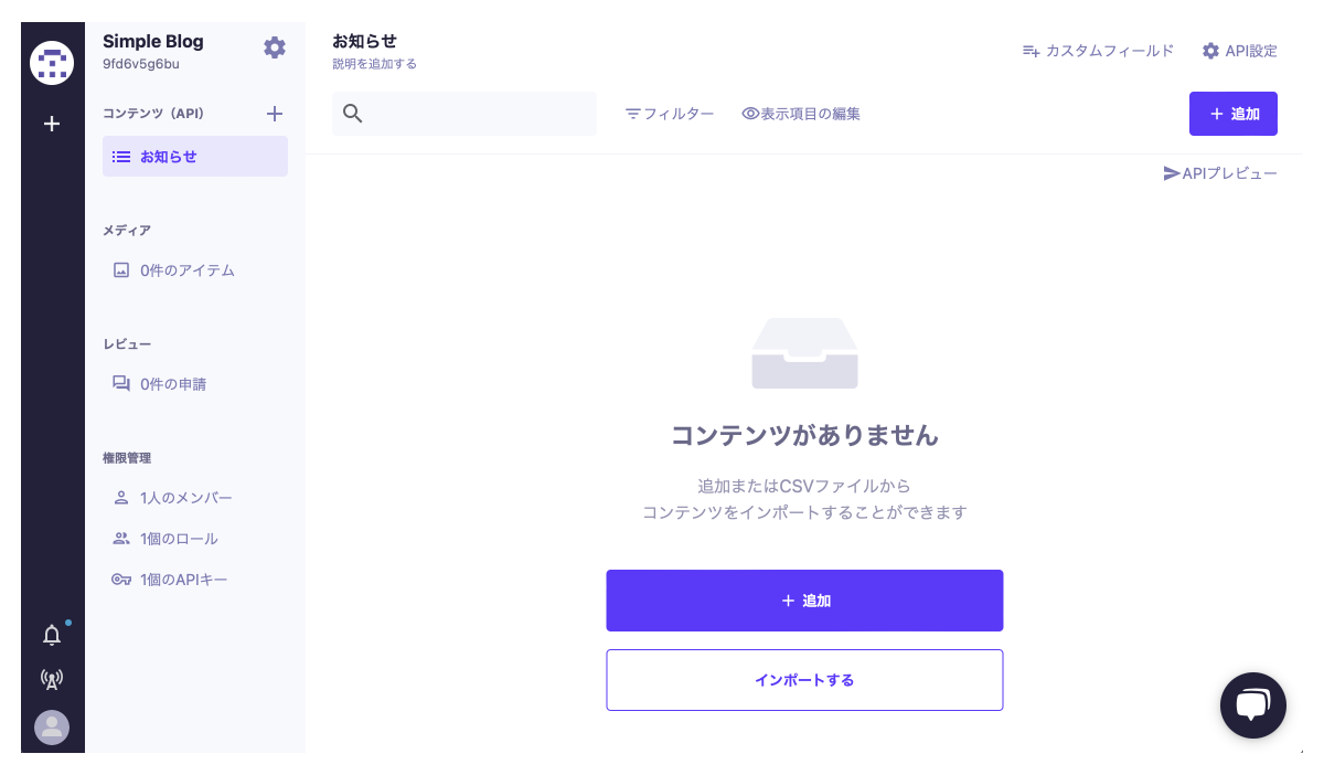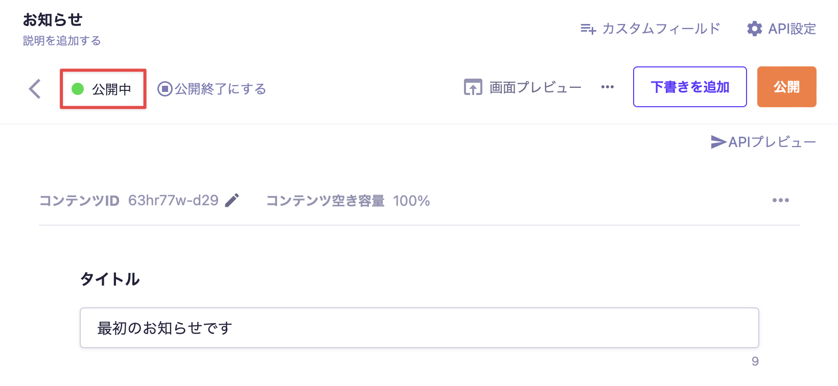 APIの作成が完了すると、サイドバーの「コンテンツ(API)」に、作成したAPI「お知らせ」が追加されます。