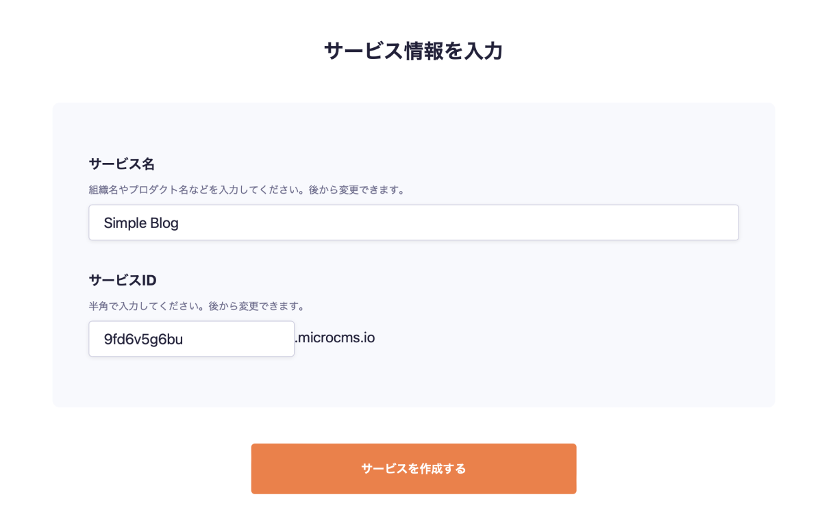 サービス名にはmicroCMSの導入を考えているプロダクト名や組織名を入力すると良いでしょう。