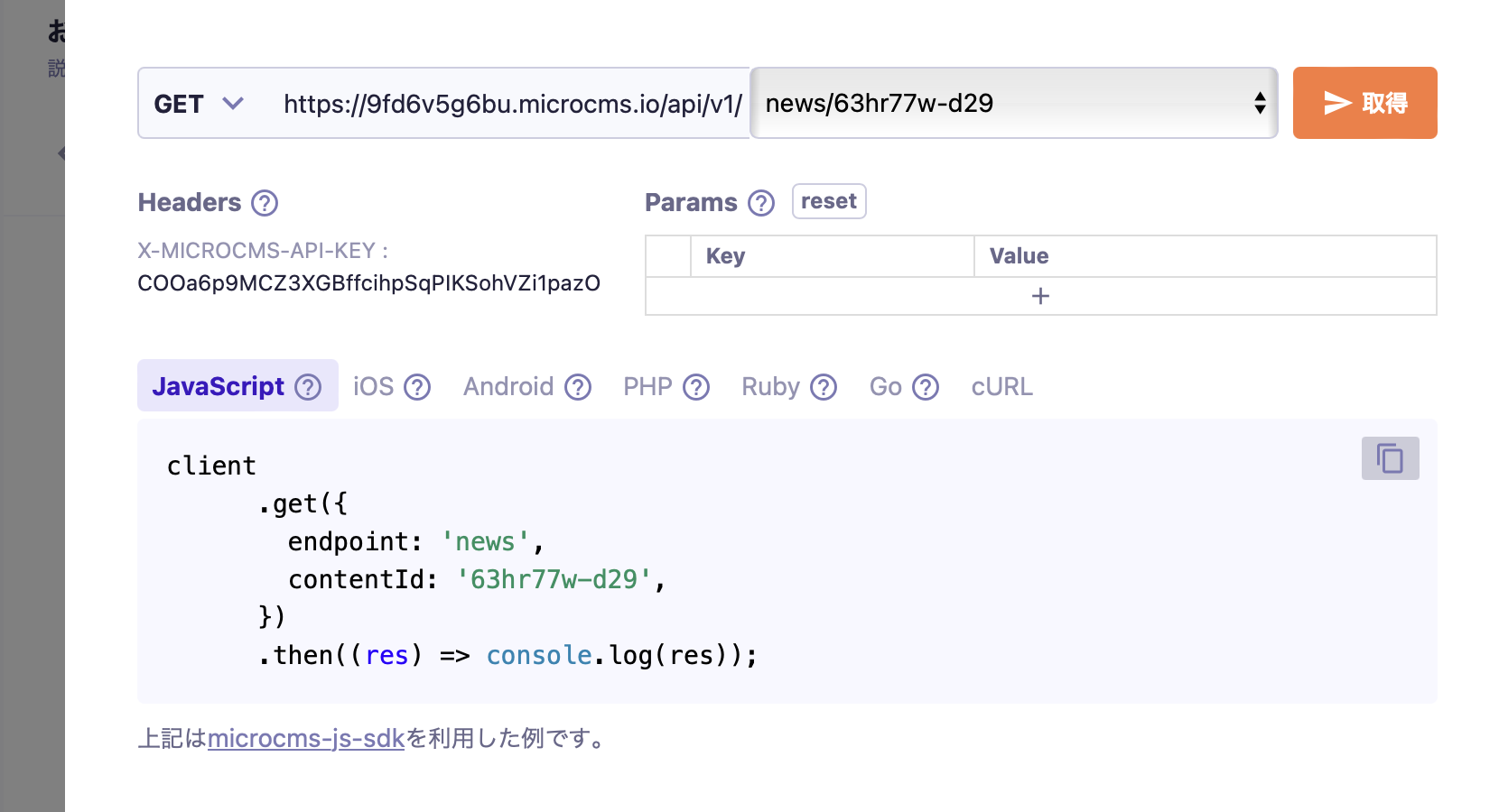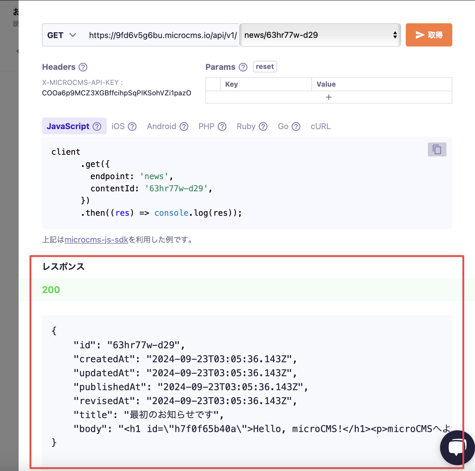 microCMSは管理画面上で簡単にAPIを試すことができる「APIプレビュー」機能が標準で搭載されています。