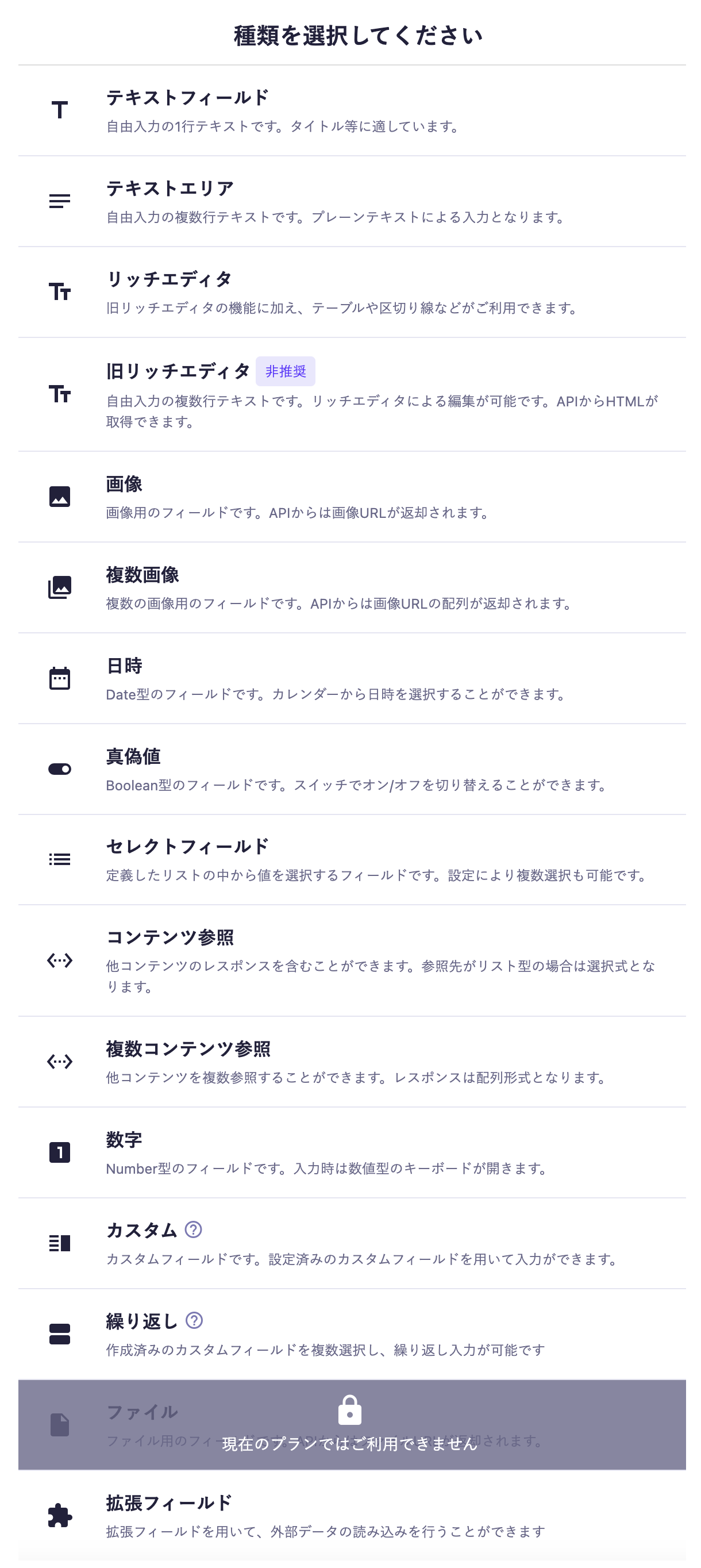 テキストフィールドやリッチエディタの他にも、画像やセレクトフィールドなど様々なフィールド種類を設定可能です。コンテンツに合わせて適切に選びましょう。