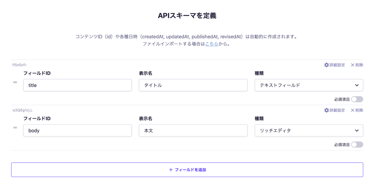 APIスキーマを定義します。[フィールドを追加]ボタンクリックして、各フィールドを追加していきます。